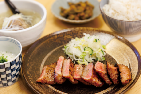 ジューシーな厚切り牛タンを炭火で焼き上げています。歯ごたえがありつつも柔らかい牛タンは、嚙むほどに旨味が口に広がります。麦ご飯やとろろ、牛テールスープ、青唐辛子味噌漬けと一緒にどうぞ。